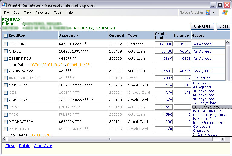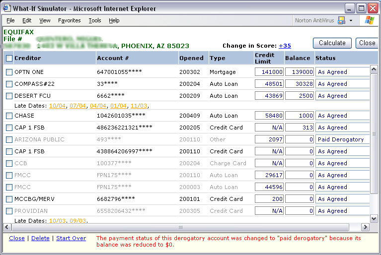 Change lates, collections, account status, balances to calculate a possible score change.